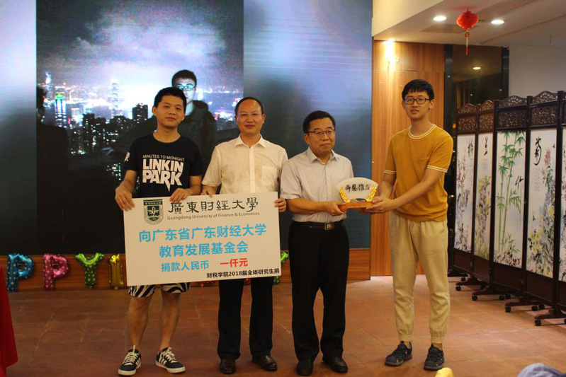 税务硕士毕业研究生吴磊代表2018届毕业研究生向学院赠予纪念品,庞磊院长代表学院接收,财政学毕业研究生刘腾腾代表2018 届研究生毕业生向学院校友基金捐款,朱信贵书记代表学院接收捐款。