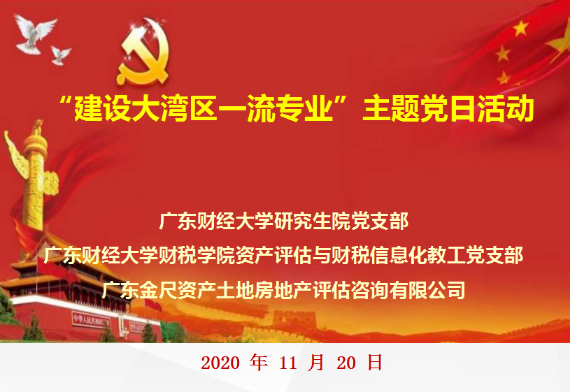 2020年11月20日,为了深入学习习近平总书记在深圳经济特区建立40周年庆祝大会上重要讲话精神,贯彻广东财经大学第一次党代会精神,建设大湾区一流资产评估专业,广东财经大学研究生院党支部与资产评估与财税信息化教工党支部21名党员到位于东莞市的广东金尺资产土地房地产评估咨询有限公司开展了“建设大湾区一流专业”主题党日活动。