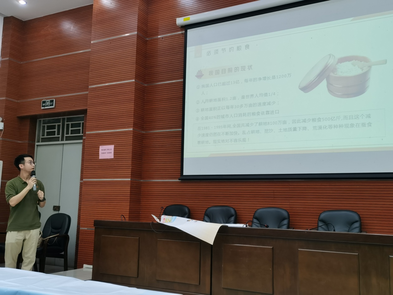 首先,研究生党支部书记梅健炜同学给大家介绍了我国粮食供给状况以及结构性短缺的现状,详尽阐述粮食浪费的危害以及节约粮食的必要性,使大家深入理解开展此次活动的意义。讲解中,同学们对校园存在的粮食浪费问题踊跃发言,各抒己见。