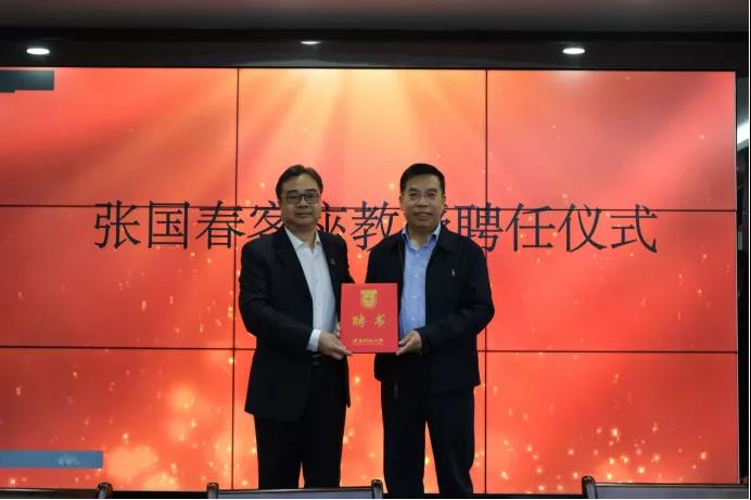 本次论坛期间,还举行了广东财经大学客座教授聘任仪式,郑贤操为张国春教授颁发了聘书并佩戴了校徽。