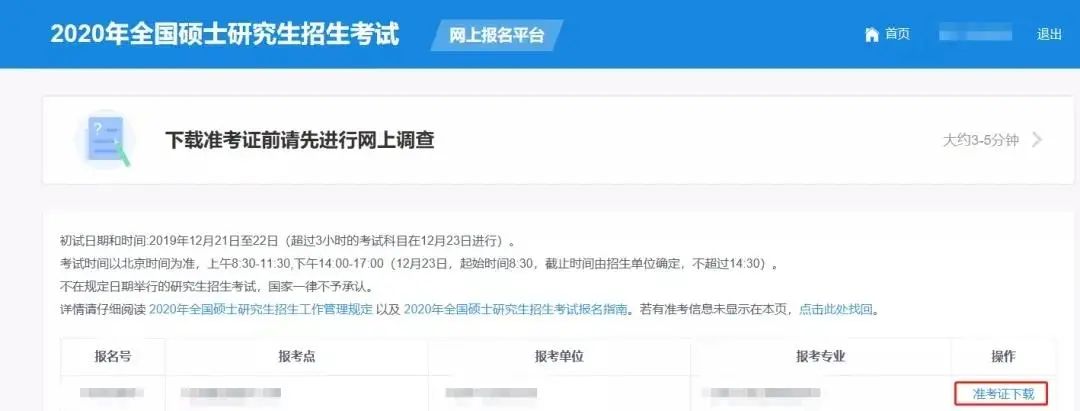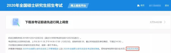 第一步,进入研招网报平台首页后,如招生单位已上传准考证,你将看到下载链接(下图右下角红框)。