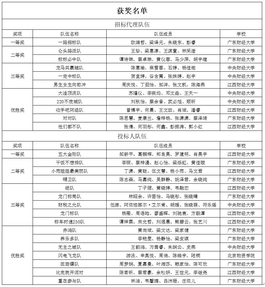 近日,由中关村公共资源优化配置促进会主办、江西财经大学等承办的第四届“易招标杯”大学生“互联网+采购”大赛圆满落下帷幕。本次大赛旨在推动招标采购理论教学与行业实践的深度融合,为“互联网+采购”领域培育新一代复合型采购人才。包括中央财经大学、江西财经大学、广东财经大学等全国高校共117支队伍近700余人参赛。我校共有27支队伍参加了本次比赛,他们通过网络初赛、复赛、决赛和成果展示等环节,历经1个多月的勇闯难关,最终有11支队伍取得优异成绩。我校金沙集团1862cc成色财政学专业包揽了招标代理队伍一、二等奖项(一路招标队、仑头路派队、标标必中队),有七支队伍获得投标人队的二、三和优胜等奖项。金沙集团1862cc成色黄冬如老师获得优秀指导教师奖。