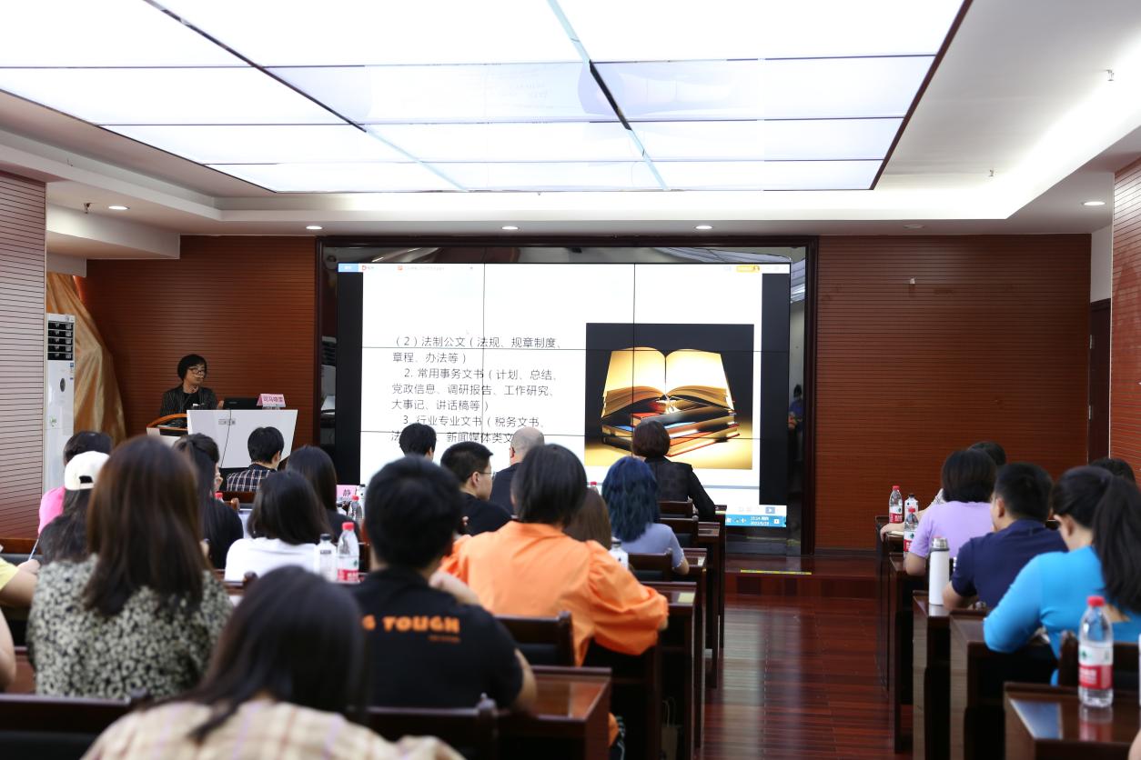 为进一步适应学校、学院事业高质量发展的需要,提高行政管理人员及学生干部队伍的公文写作能力和业务水平,5月19日,金沙集团1862cc成色、艺术与设计学院和法学院等学院在北2-338教室联合举办公文写作专题培训会。广东省语言文字督导评估专家、原人文与传播学院中文系教授司马晓雯以“谈谈常用公文的写作”为主题开展了一场生动的讲座。艺术与设计学院党委书记彭翠峰,法学院党委书记陈静,金沙集团1862cc成色党委副书记李愿方,法学院党委副书记方继勇以及三个学院的行政管理人员、学生干部等50余人参加了培训会。培训会由金沙集团1862cc成色党委书记吴瑛主持。