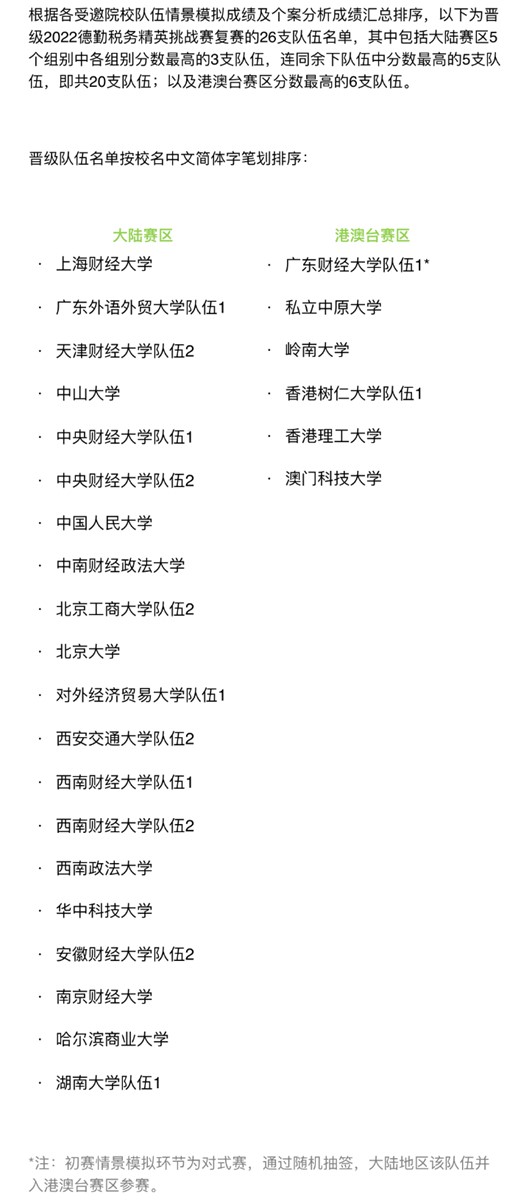 2022德勤税务精英挑战赛初赛已于2022年10月15日落下帷幕,金沙集团1862cc税务系研究生和本科生在经过校内300多人激烈的竞争选拔中成功组成参赛队伍,经过一整天高强度的初赛,成功从大陆及港澳台共82支高校队伍中脱颖而出,成为26支晋级队伍之一,将代表广东财经大学参加德勤税务精英挑战赛复赛。