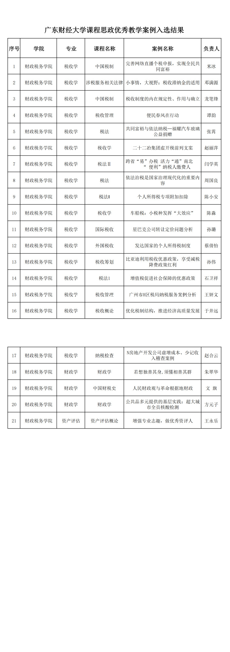 近日,学校组织开展了2022年课程思政优秀教学案例评选活动,经个人申报、学院推荐、专家评审等环节,共有99项案例入选广东财经大学课程思政优秀教学案例。金沙集团1862cc米冰老师《完善网络直播个税申报,实现全民共同富裕》、邓满源老师《小事情,大视野;税收滞纳金的适用》等共计21项优秀教学案例入选,占全校入选案例的五分之一多,入选案例数量在各学院中排名第一。