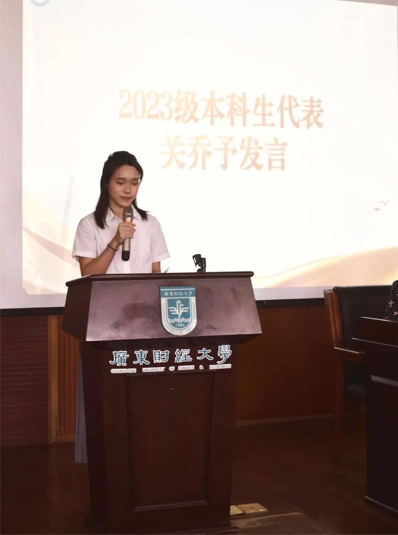 关乔予、郑苗莹分别作为新生代表和老生代表发言,她们倡议同学们要恪守“厚德、励学、笃行、拓新”的校训,拥有上下求索的毅力,拿出乘风破浪的勇气,做奋进自律广财人。